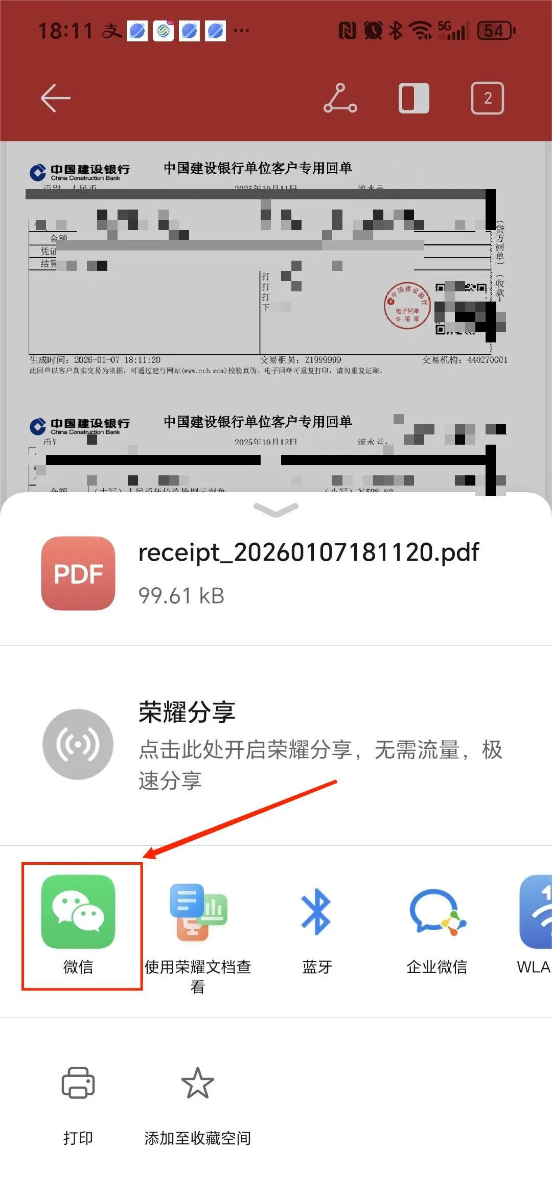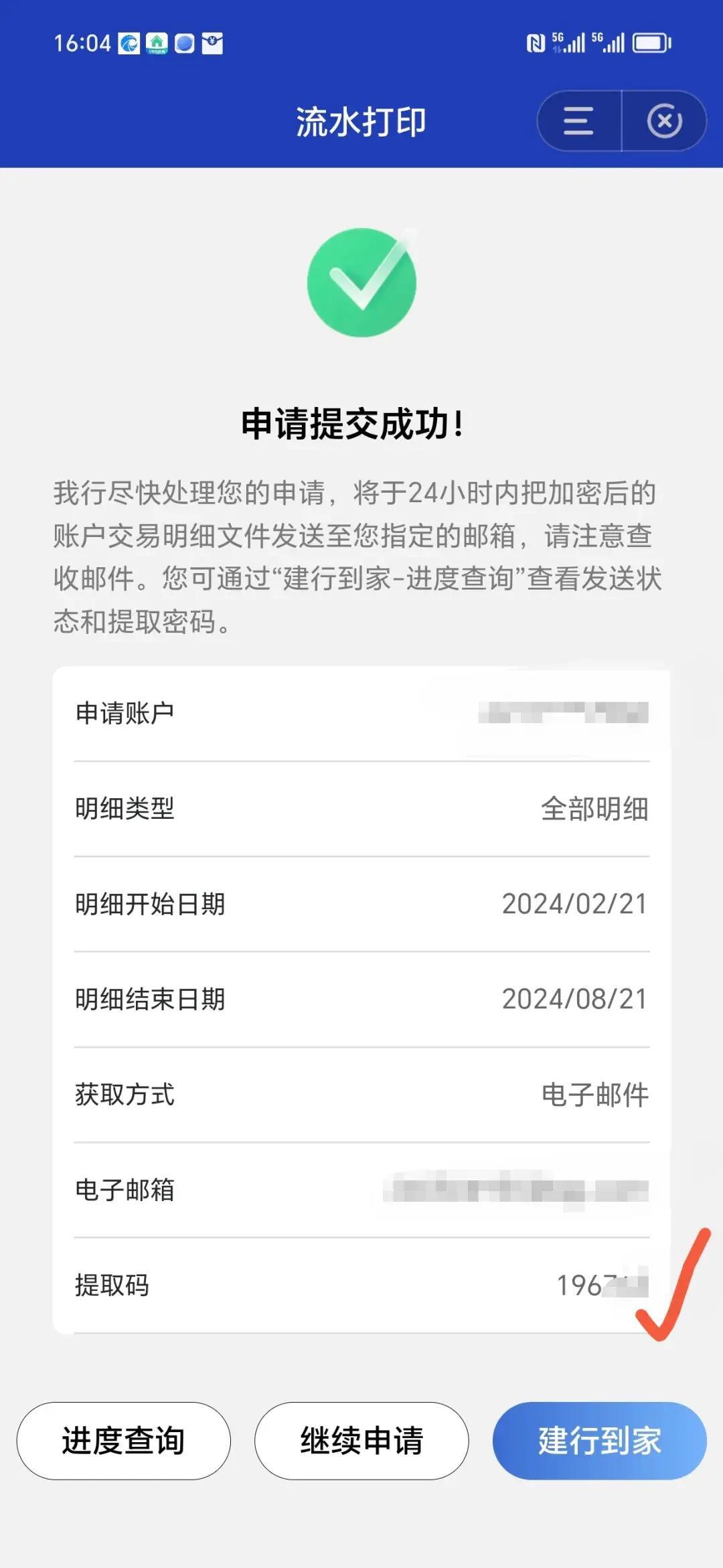 打开你的邮箱,找到建行发送的流水文件,输入提取码即可查看。