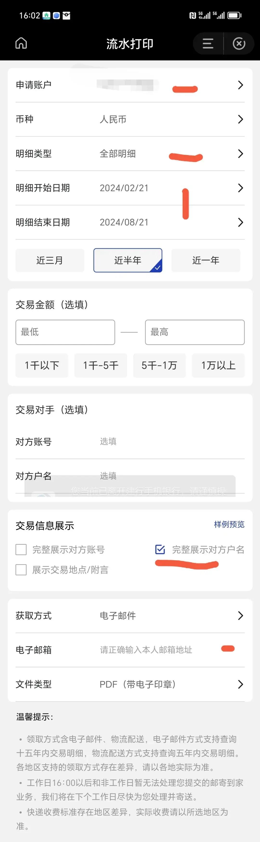 选择你要导出的账户、勾选“全部明细”、设置开始和结束日期,别忘了勾选“完整展示对方户名”、“完全展示对方账号”和“展示交易地点/附言”。