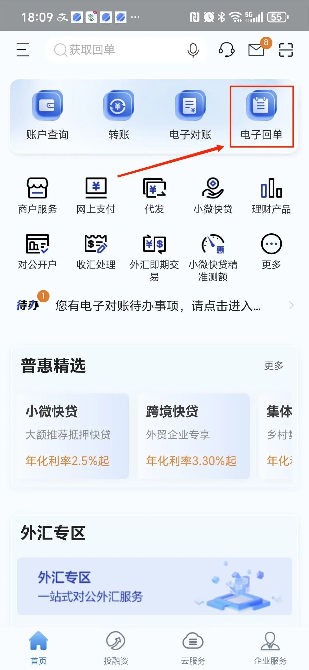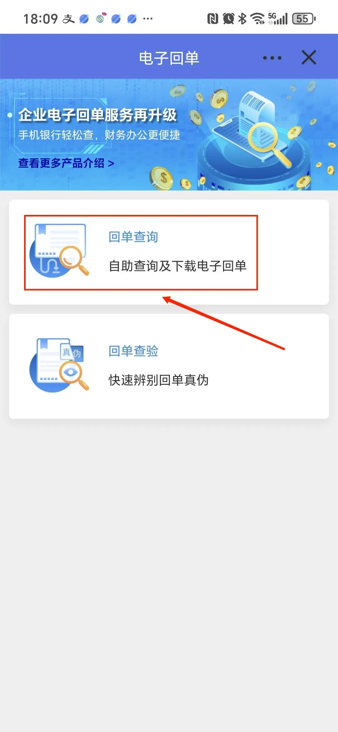 在首页右上区域选择 “电子回单”或者“更多…”里面的“电子回单” ,接着点开“回单查询”。